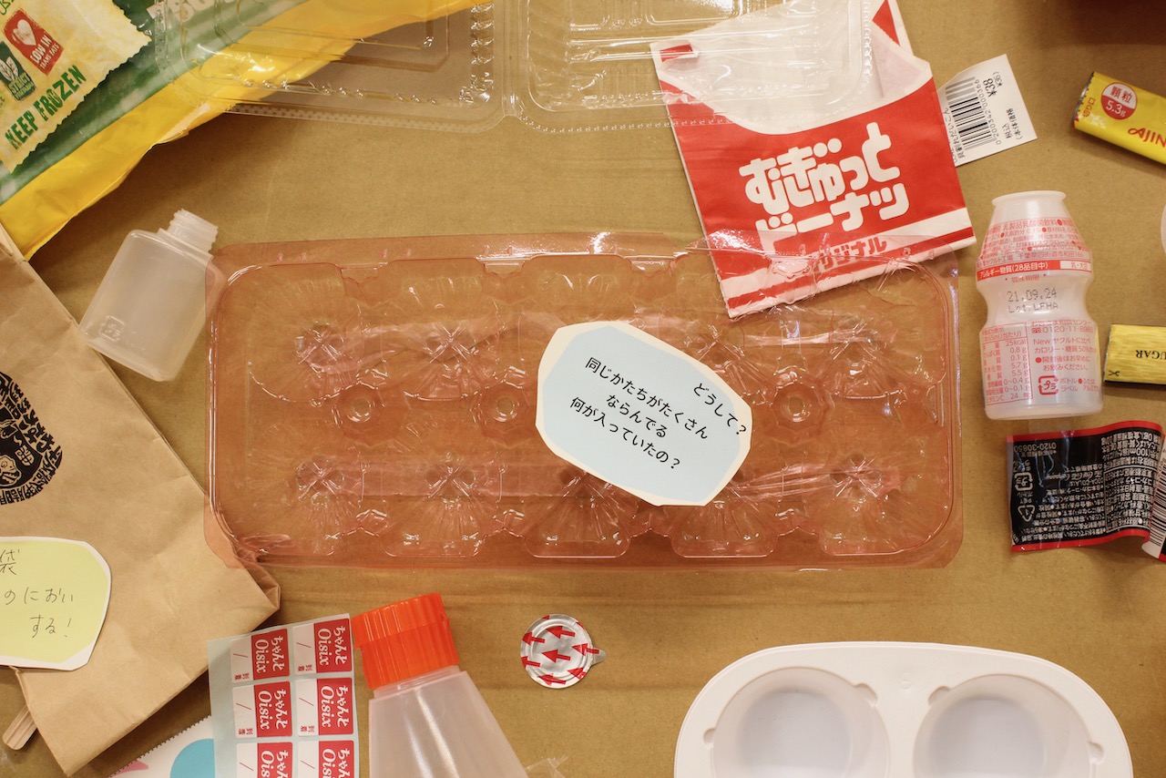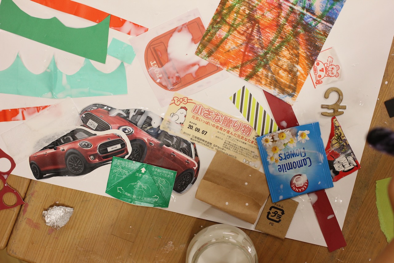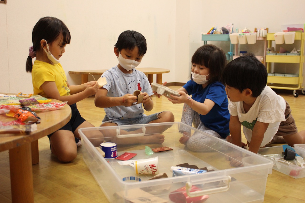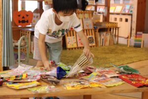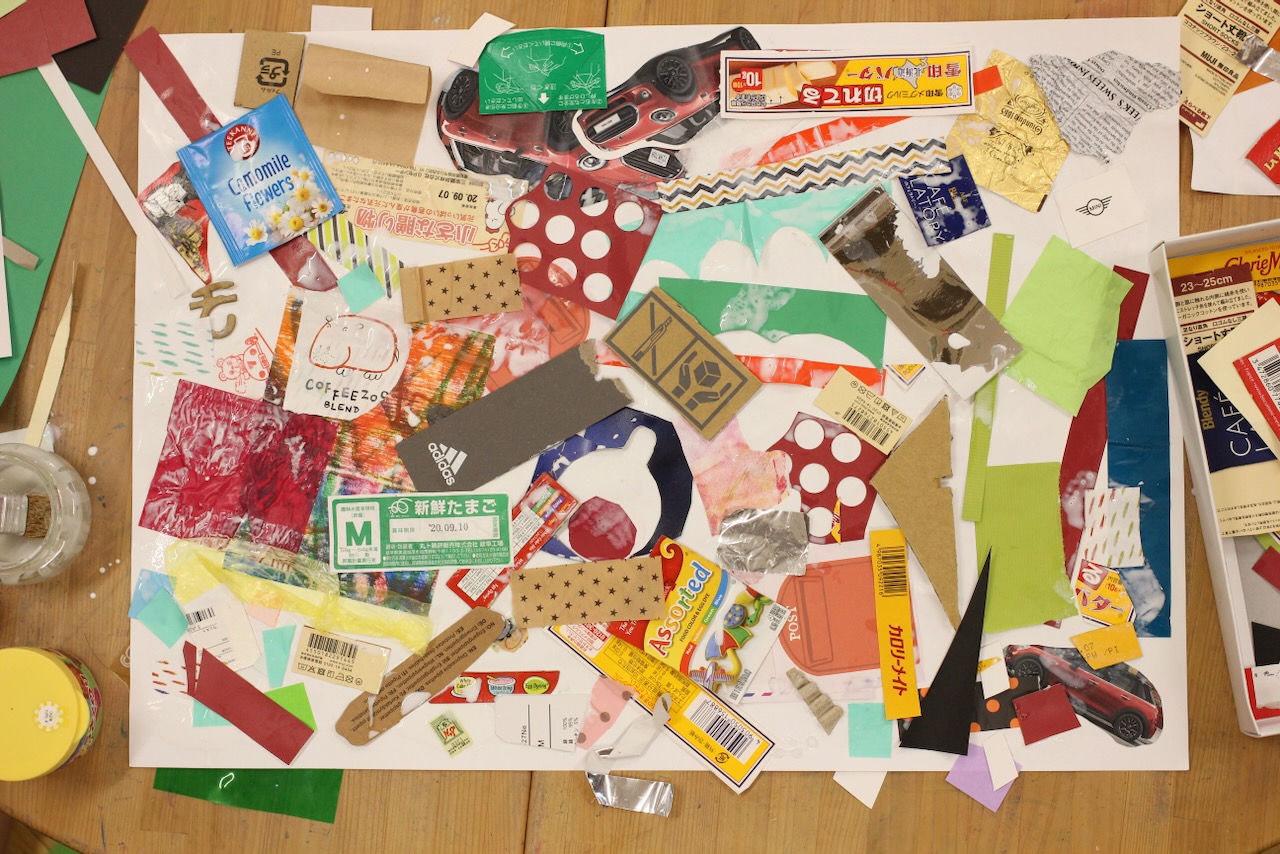 日々生活の中で使われるものや食品類の廃材は、意識して集めてみると思った以上にたくさん廃棄していることに気づくのではないでしょうか。空き箱やプラスチック製容器など、さまざまな種類がある廃材を「何かに使えそう」と集めても、うまく活用されないことが多くあると思います。それなら、廃材そのもののかたち、色柄、ロゴやイラストなどを観察して楽しんでみましょう。新たな遊びや製作イメージを膨らませる視点と発想が、子ども達の中に生まれるかもしれません。壁面装飾や造形準備で出た紙の端材、子どもが一度使ってくしゃくしゃになった折り紙なども集めておくと、コラージュ遊びも楽しめます。