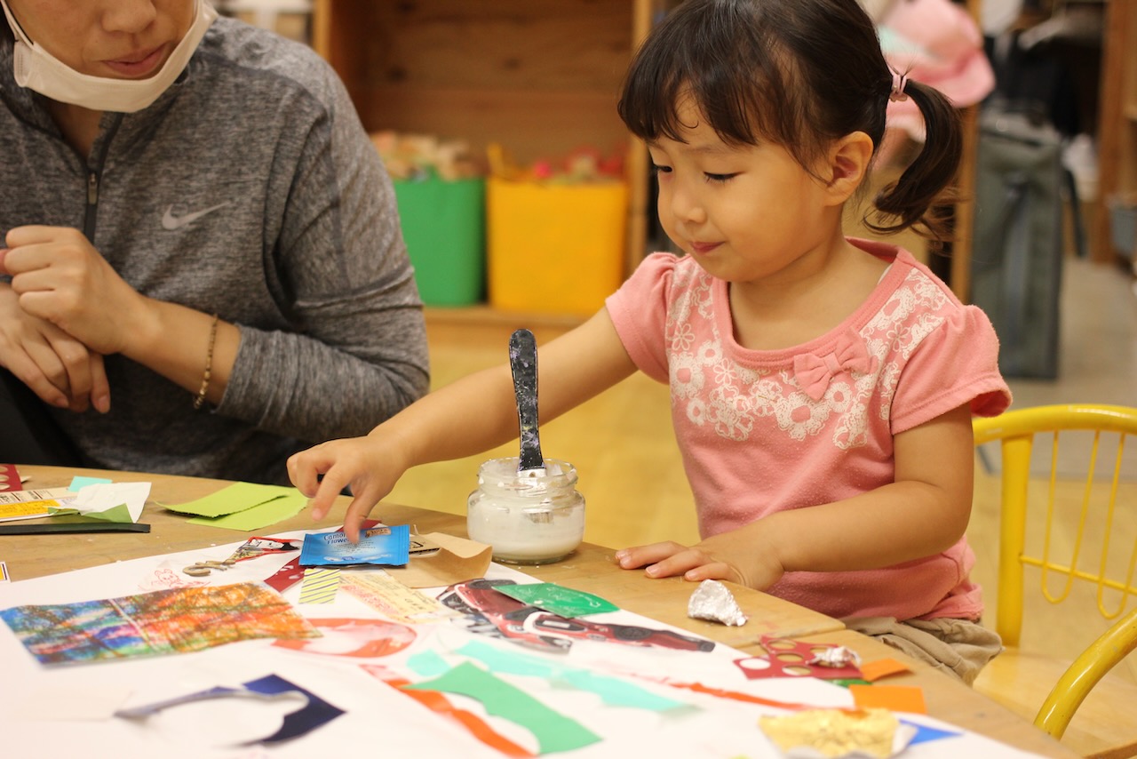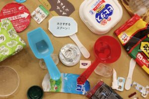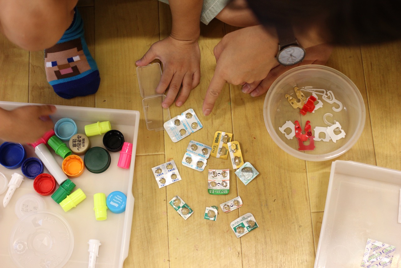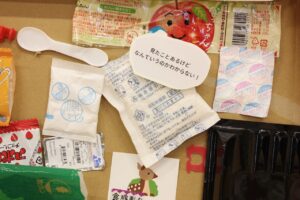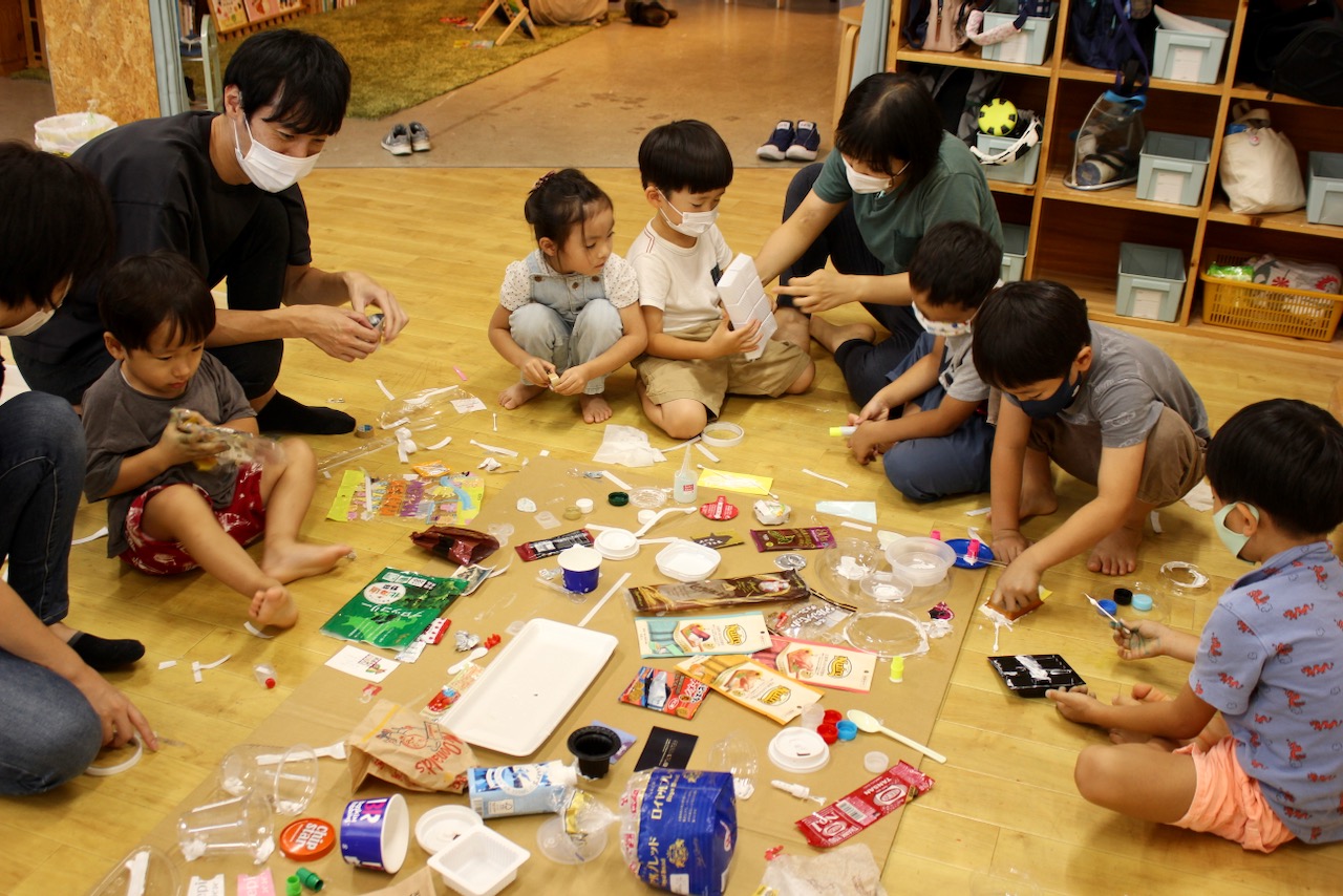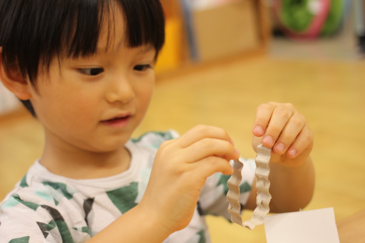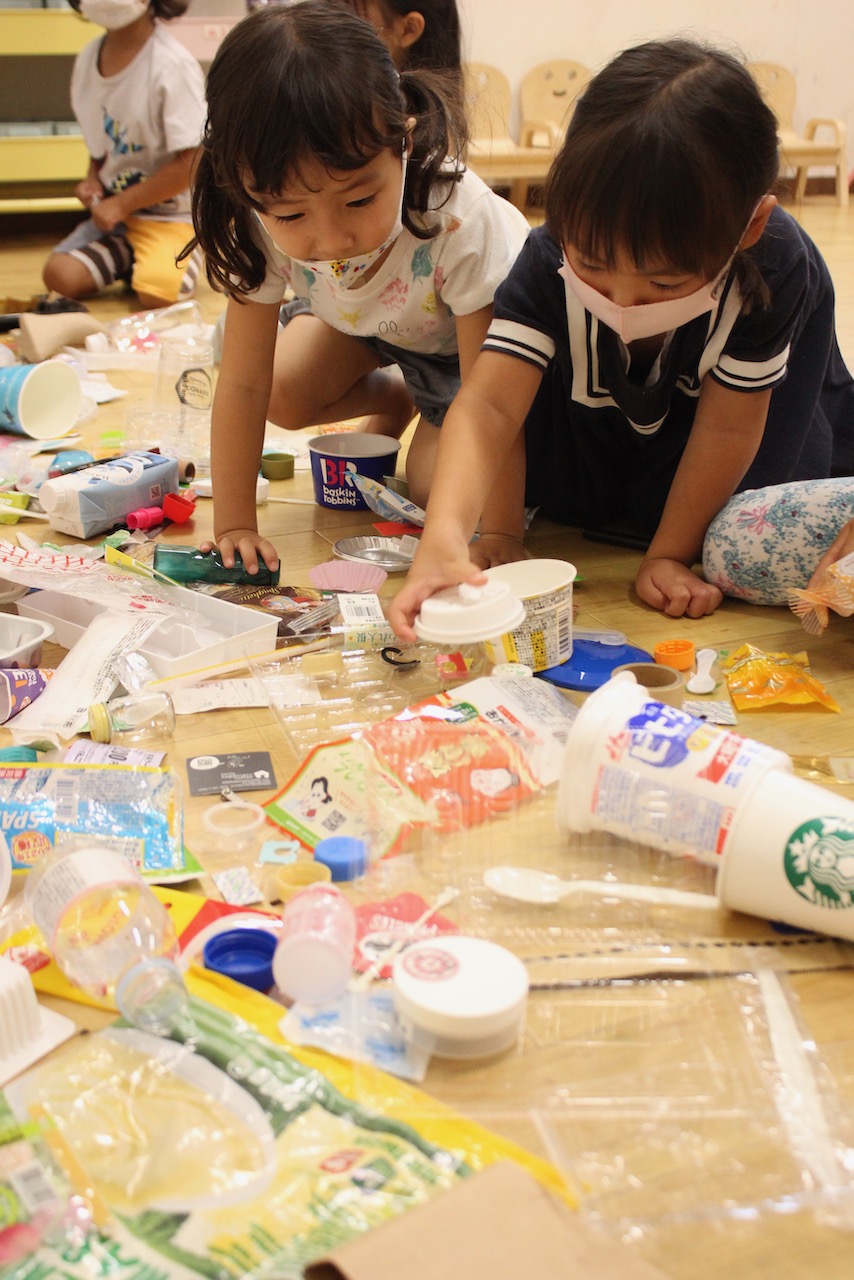 日々生活の中で使われるものや食品類の廃材は、意識して集めてみると思った以上にたくさん廃棄していることに気づくのではないでしょうか。空き箱やプラスチック製容器など、さまざまな種類がある廃材を「何かに使えそう」と集めても、うまく活用されないことが多くあると思います。それなら、廃材そのもののかたち、色柄、ロゴやイラストなどを観察して楽しんでみましょう。新たな遊びや製作イメージを膨らませる視点と発想が、子ども達の中に生まれるかもしれません。壁面装飾や造形準備で出た紙の端材、子どもが一度使ってくしゃくしゃになった折り紙なども集めておくと、コラージュ遊びも楽しめます。