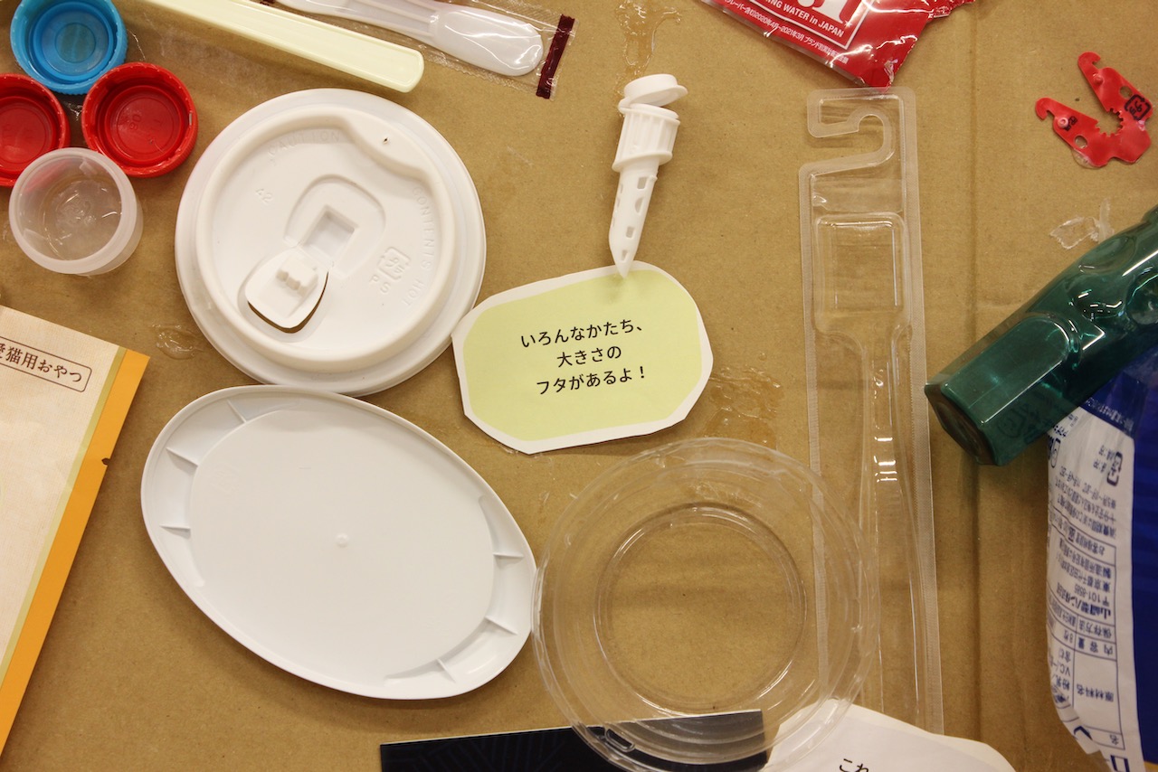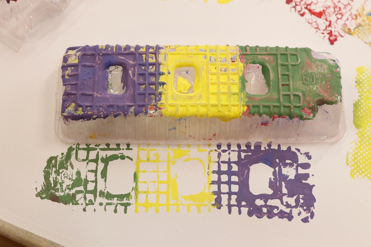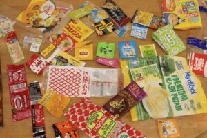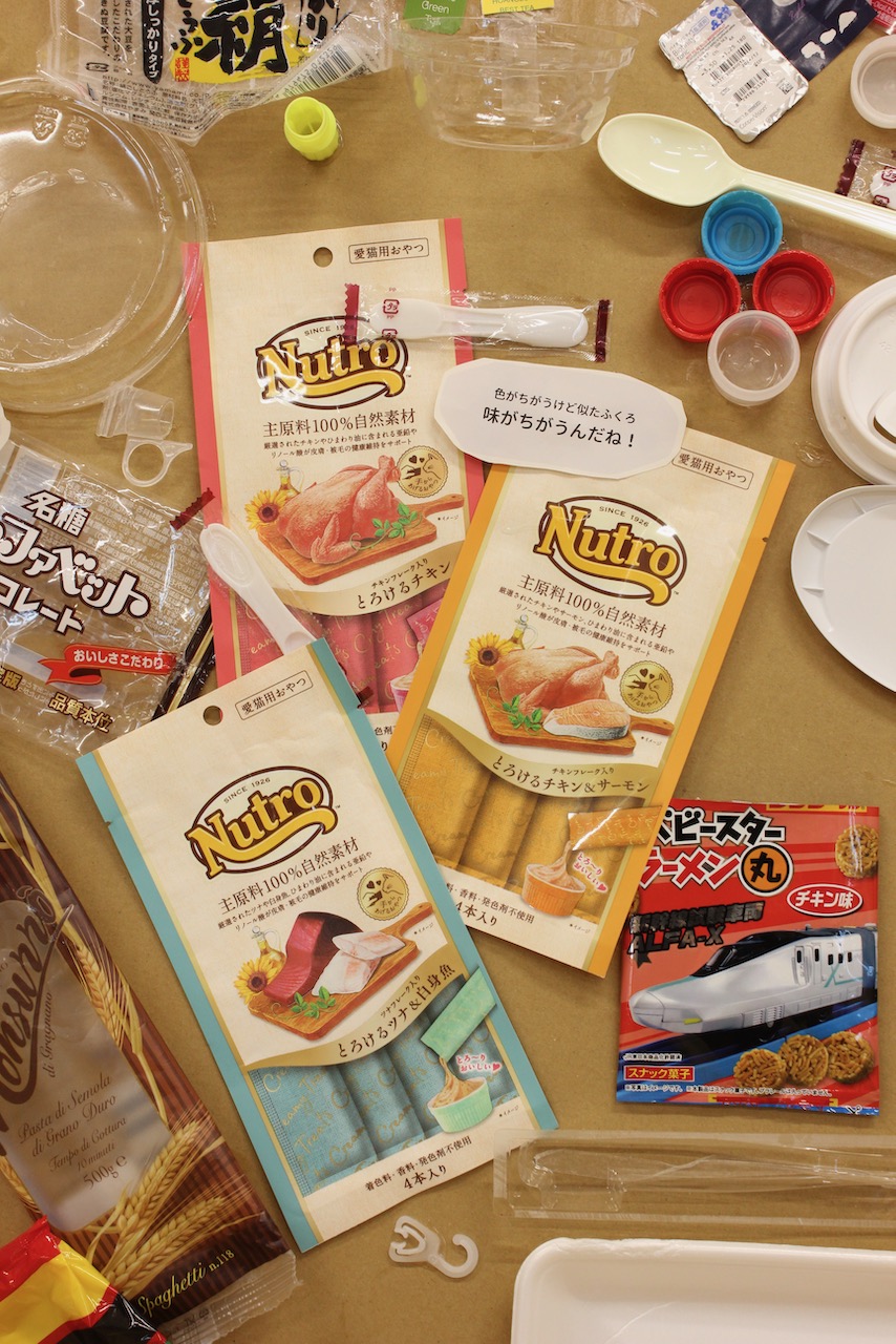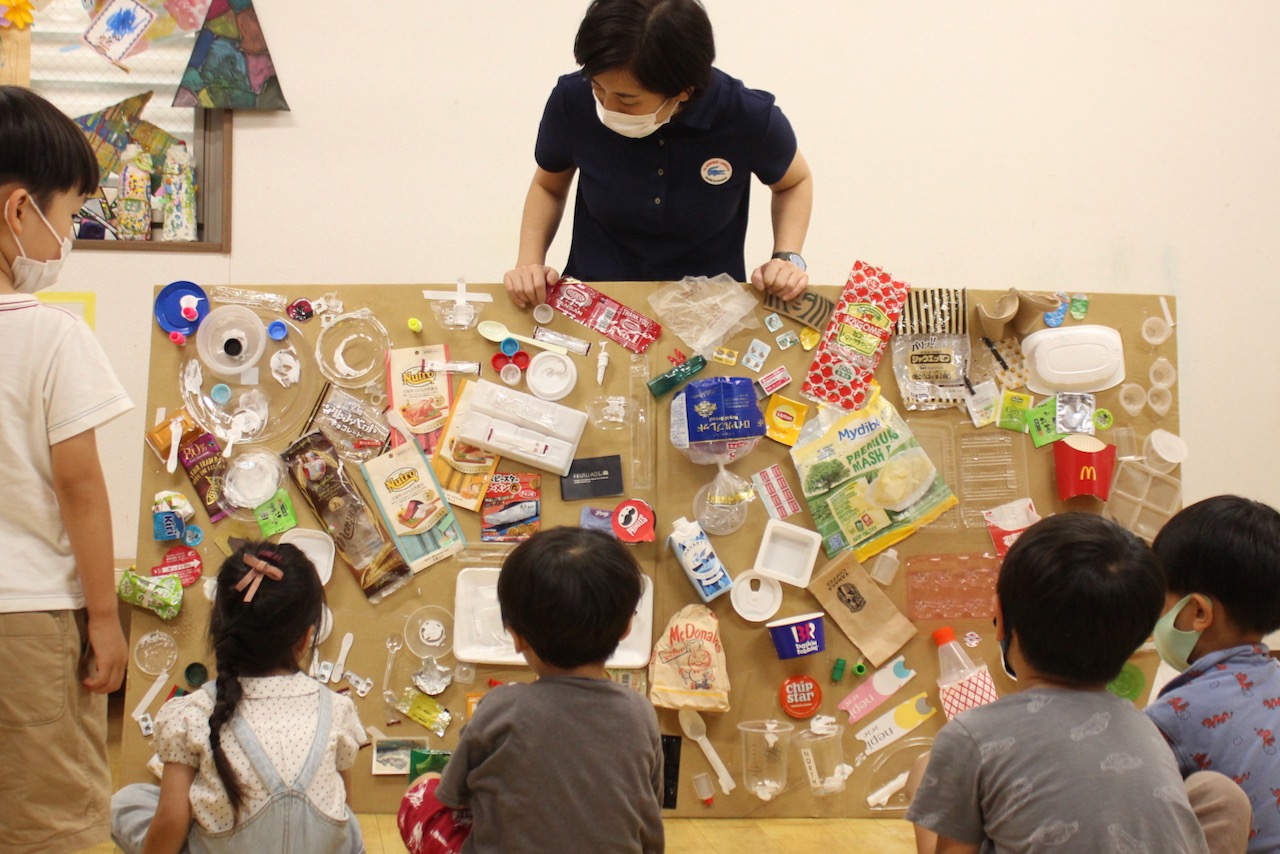 日々生活の中で使われるものや食品類の廃材は、意識して集めてみると思った以上にたくさん廃棄していることに気づくのではないでしょうか。空き箱やプラスチック製容器など、さまざまな種類がある廃材を「何かに使えそう」と集めても、うまく活用されないことが多くあると思います。それなら、廃材そのもののかたち、色柄、ロゴやイラストなどを観察して楽しんでみましょう。新たな遊びや製作イメージを膨らませる視点と発想が、子ども達の中に生まれるかもしれません。壁面装飾や造形準備で出た紙の端材、子どもが一度使ってくしゃくしゃになった折り紙なども集めておくと、コラージュ遊びも楽しめます。