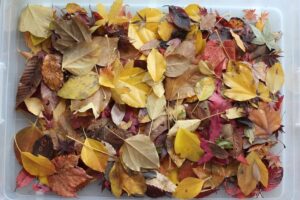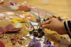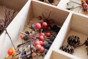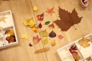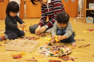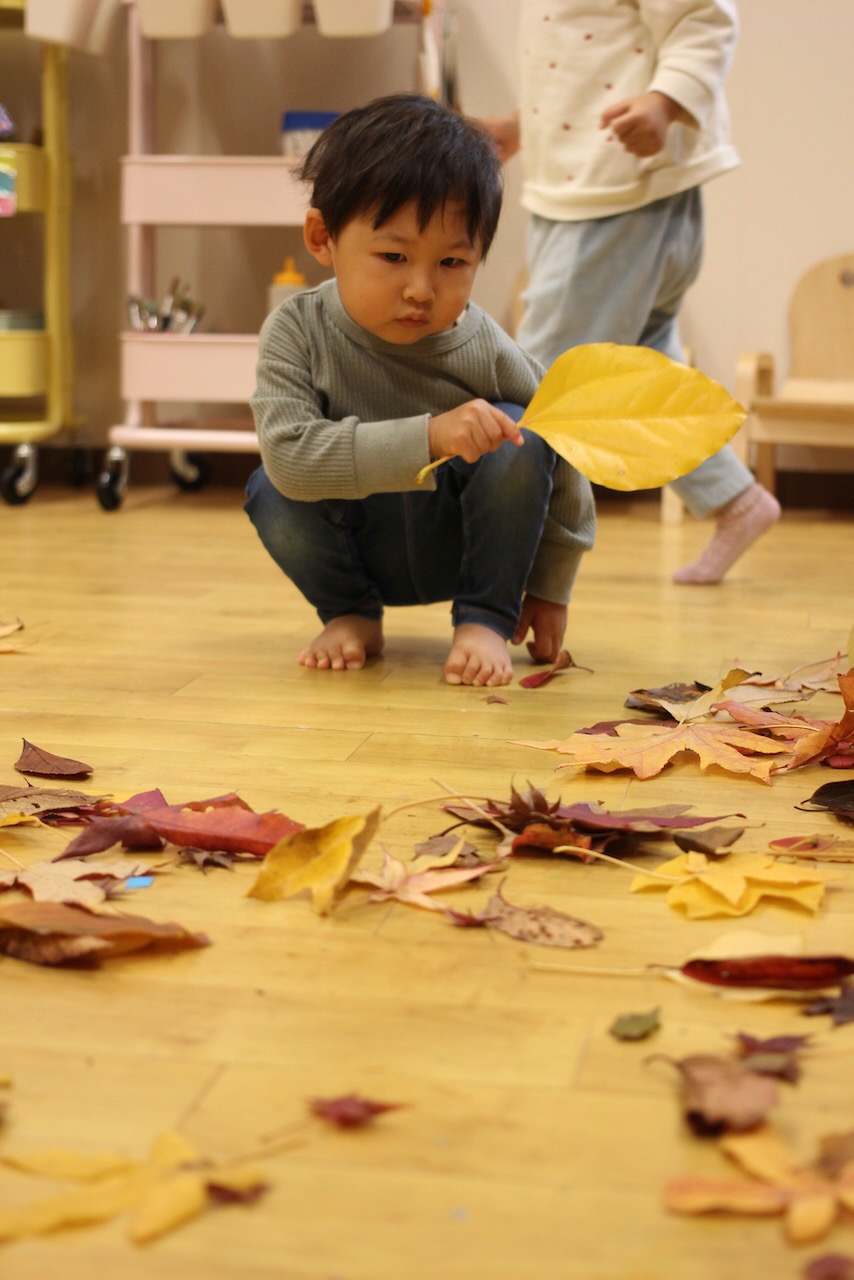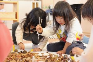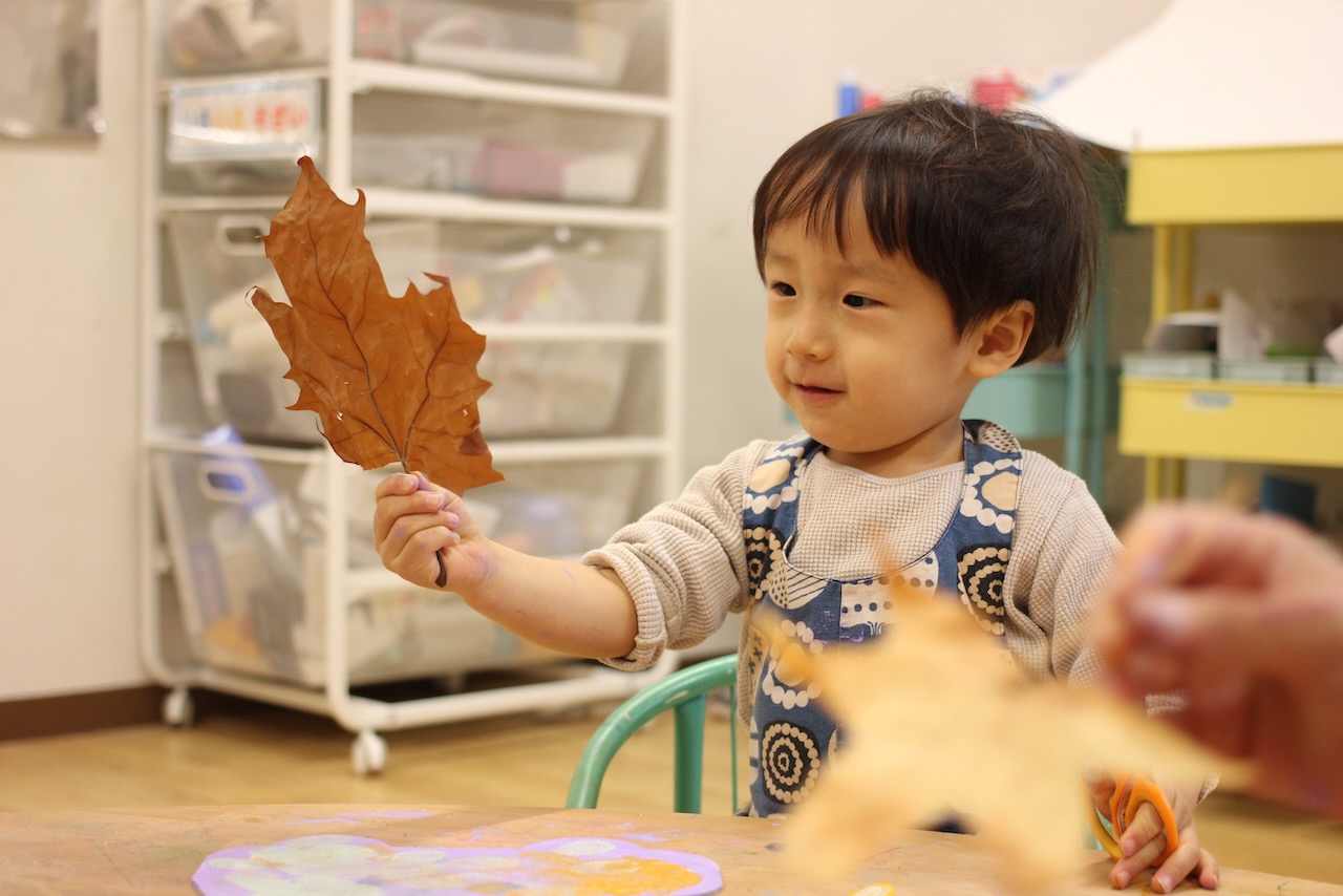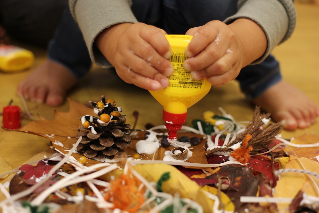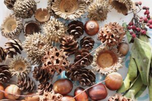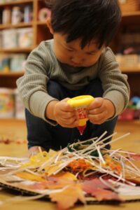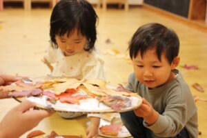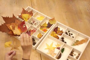 秋の香りや色味がたっぷりの自然素材。どんぐりや落ち葉といった身近な素材の他にも、緑から黄色や赤へと色づいたばかりのカエデの葉や、白く可愛いナンキンハゼ、ちくちくした見た目のフウの実など、子どもの興味をひきつけるさまざまな種類の素材を集めて楽しみましょう。