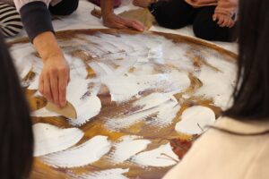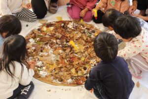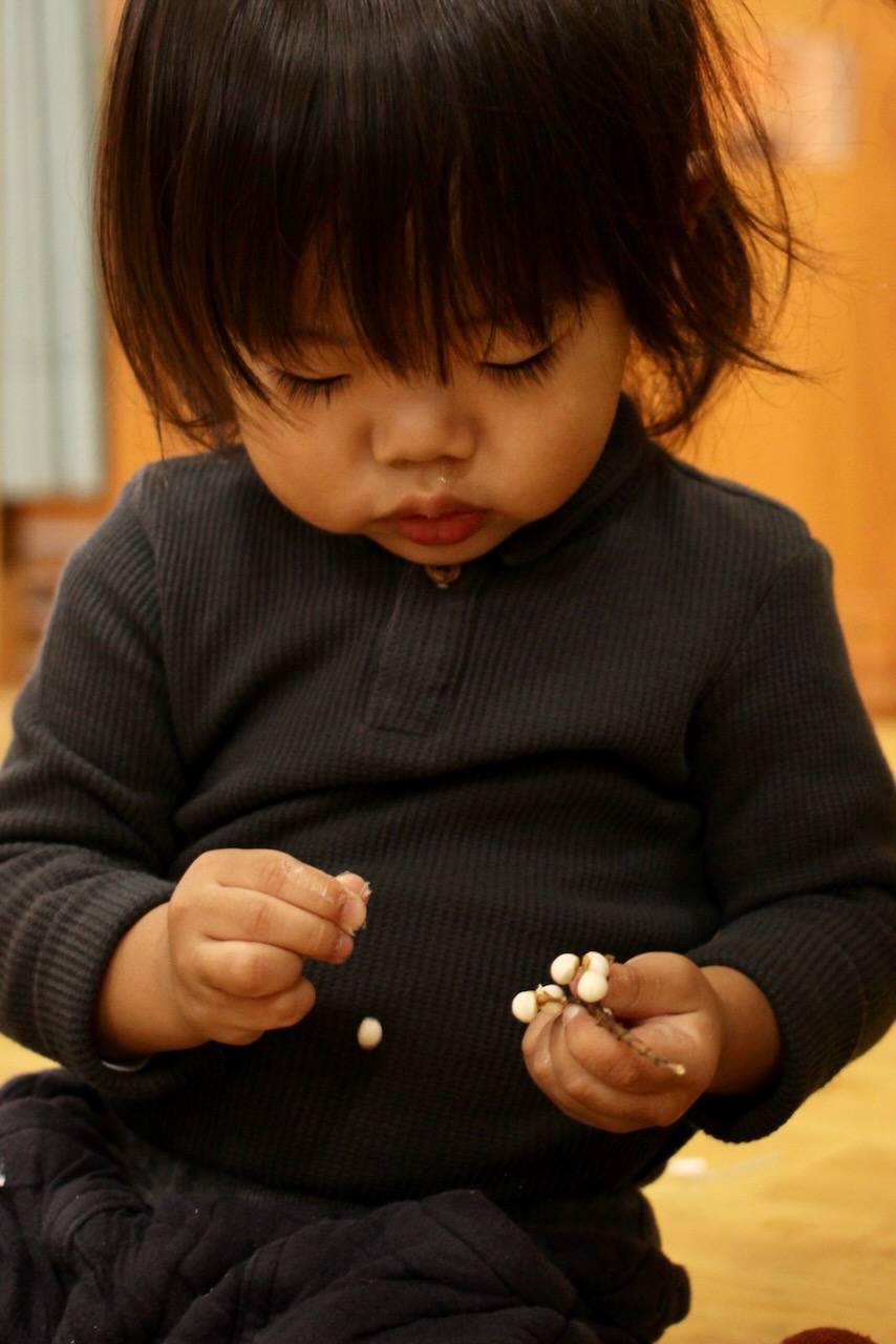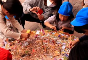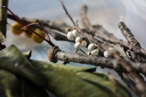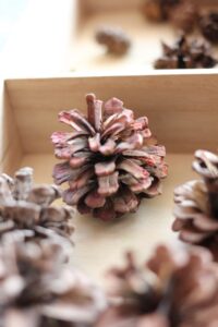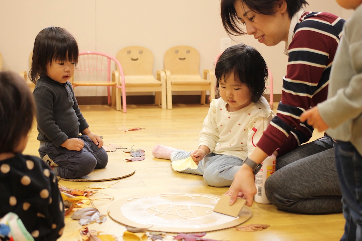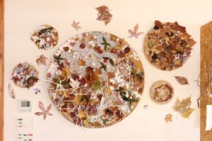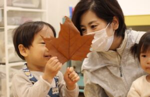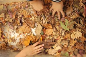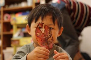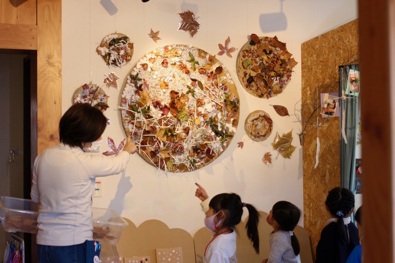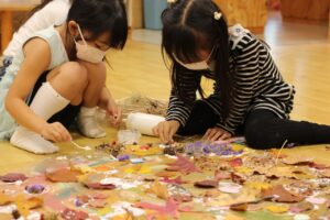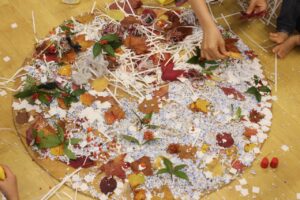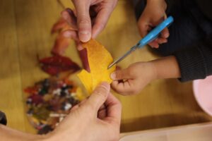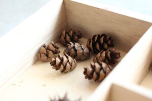 秋の香りや色味がたっぷりの自然素材。どんぐりや落ち葉といった身近な素材の他にも、緑から黄色や赤へと色づいたばかりのカエデの葉や、白く可愛いナンキンハゼ、ちくちくした見た目のフウの実など、子どもの興味をひきつけるさまざまな種類の素材を集めて楽しみましょう。